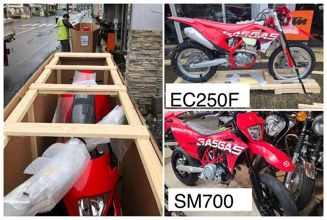 モトビルドgasgas第1便です❣️モタードのSM700と4ストエンデューロEC250Fです。 SM700は今月末モテギで行われるイベントで試乗車として活躍します! EC250Fを奥でウキウキで開梱してる人がいました!ニヤけが止まらない様子でした。
