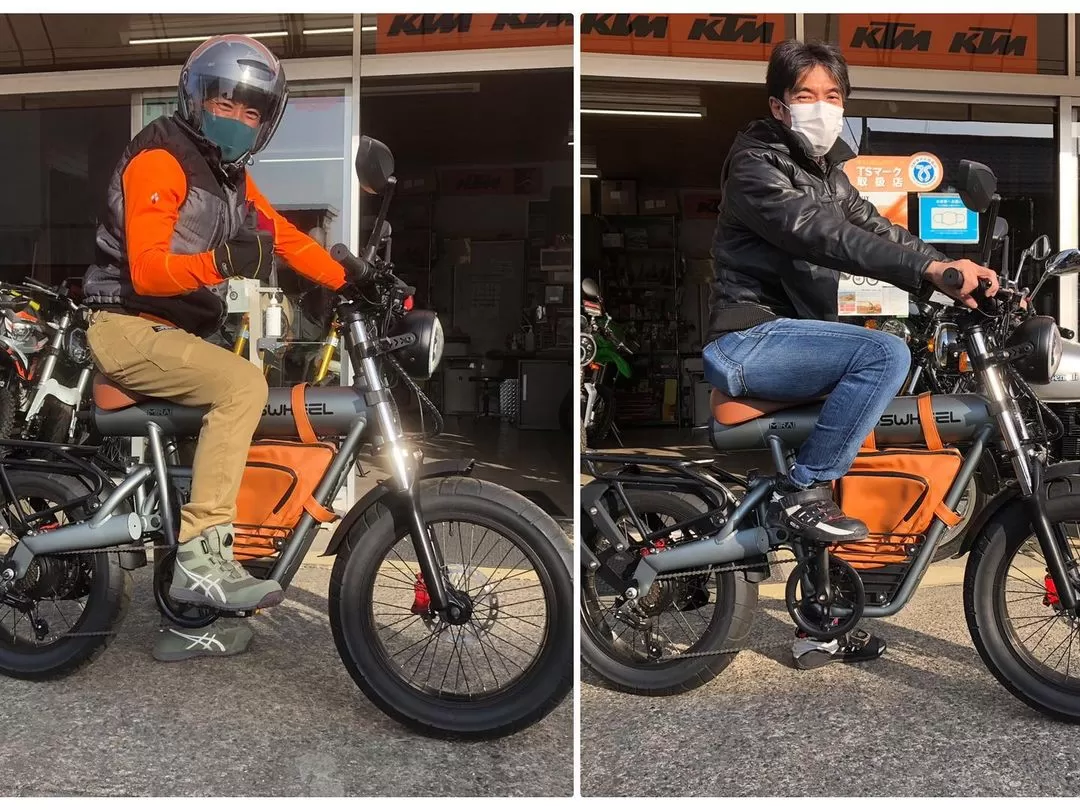 専用バッグを付けた試乗車の原付50ccクラス、500w電動車ミライsはなかなか楽しい!と高評価いただきました。車の免許があればご家族でも気軽にお使いいただけます♪