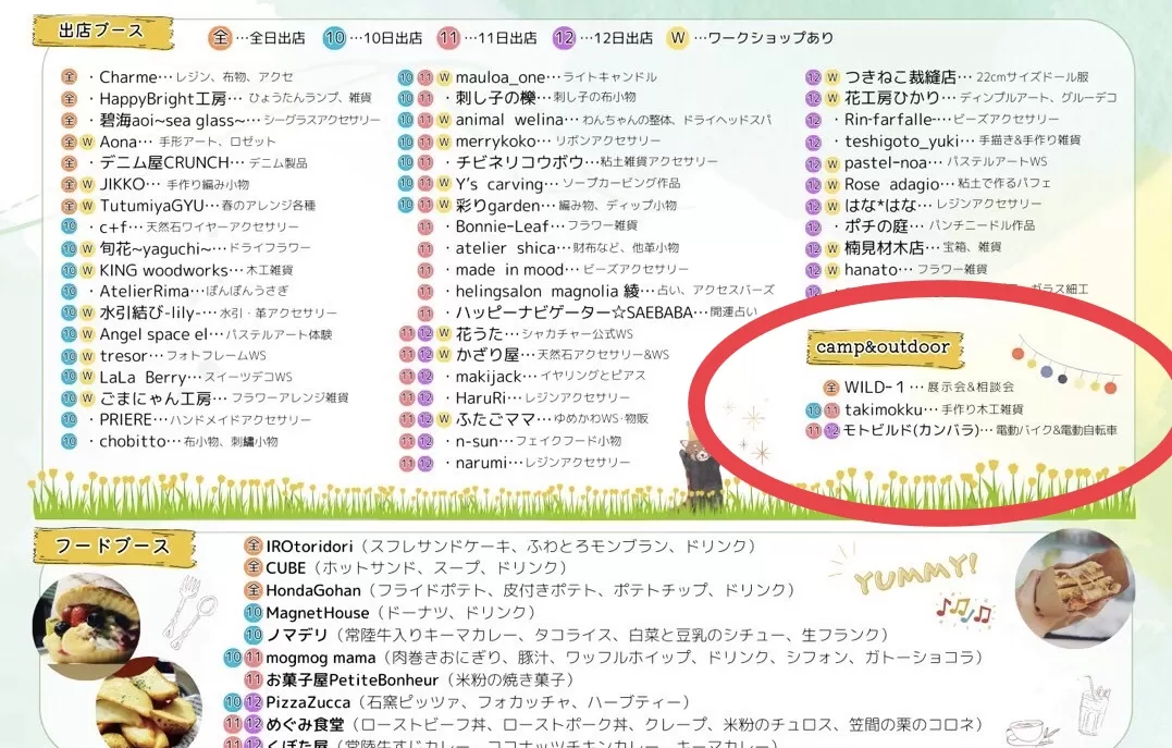 ご家族で楽しめる「ミライ」と電動車「サーロン」を引っ提げまして、手作り品や美味しい物が沢山出店する「手作りの森マルシェ」で、モトビルドはアウトドアショップ「Wild-1」とともにアウトドアエリアを展開します。