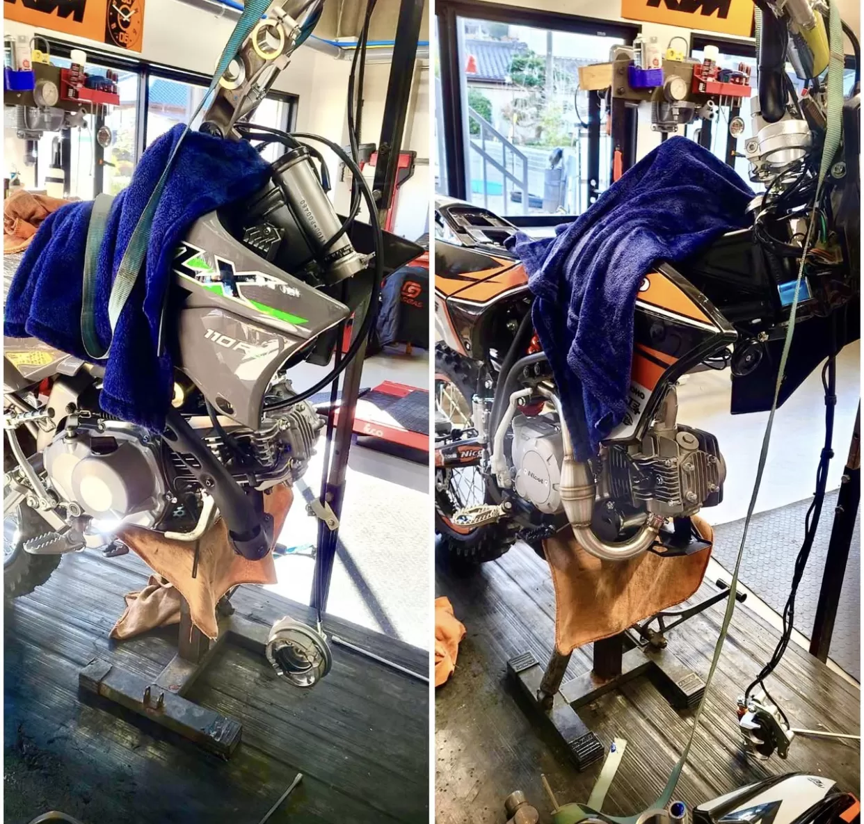 納車整備の様子#ニコット、カワサキ 納車前整備は各部のグリスアップのためお時間いただいております。カワサキ110のスイングアームについてはブッシュなのでシャフトのみグリスアップ。