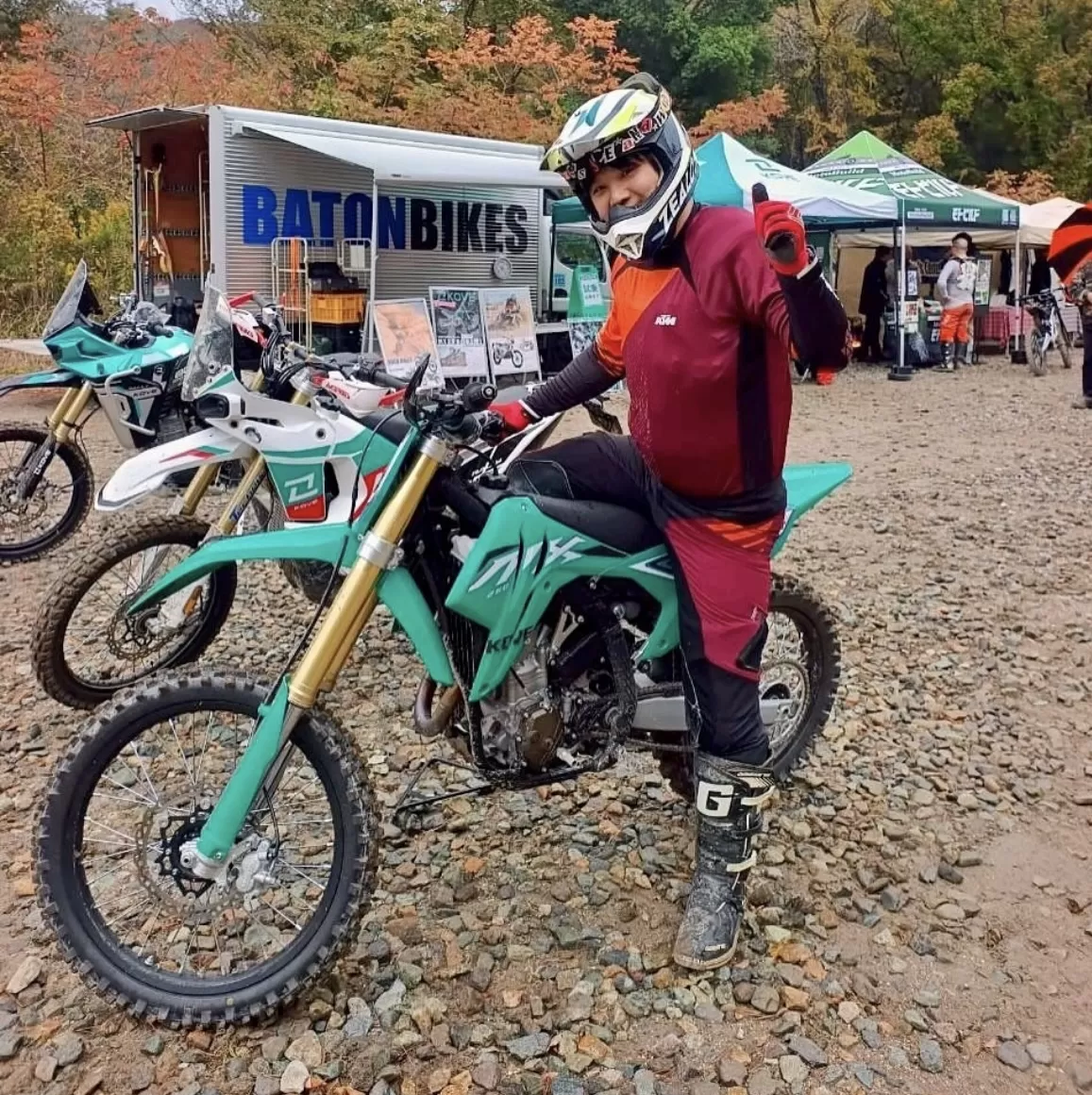 モトクロスらしくサスペンションが硬めでダンピングも強く、エンデューロバイクに慣れている僕には手強そうでしたが、乗ってみると250にしてはトルクがあり扱いやすいエンジンでした。エンデューロコースではどうしてもサスペンションが硬いものの、エンジン的には余裕を感じます。いいマシンです。きっと出るエンデューロマシンへのフィードバックが楽しみです。