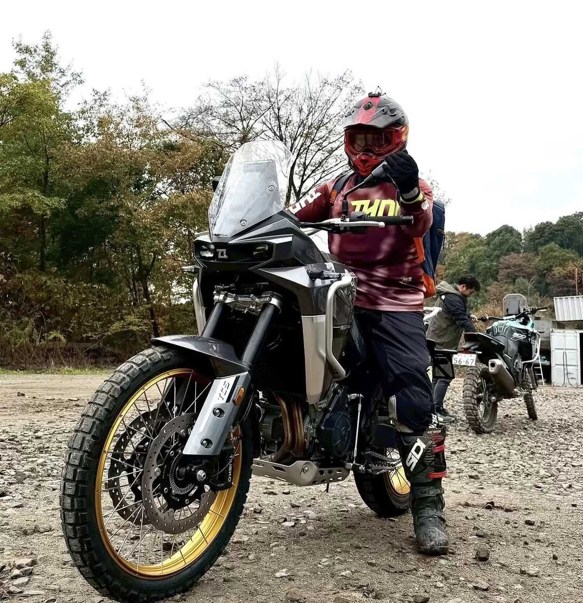 RALLYよりもロードツーリング重視の設計で、サスペンションのトラベル量は短くブレーキも強力なダブルディスク。トラクションコントロールも付いていて公道での安心感が高くなっています。サスストロークを抑えてあるためかギア比のせいか、同じ走行モードでもスロットルレスポンスが早く感じました。リアショックのプリロード調整を素手で変えられたり大きなグラブバーが付いていてタンデムもしやすそうです。ミドルサイズのトラベルアドベンチャーとして、舗装路、未舗装路、どちらも楽しめます。カッコいいし。byメカガリ