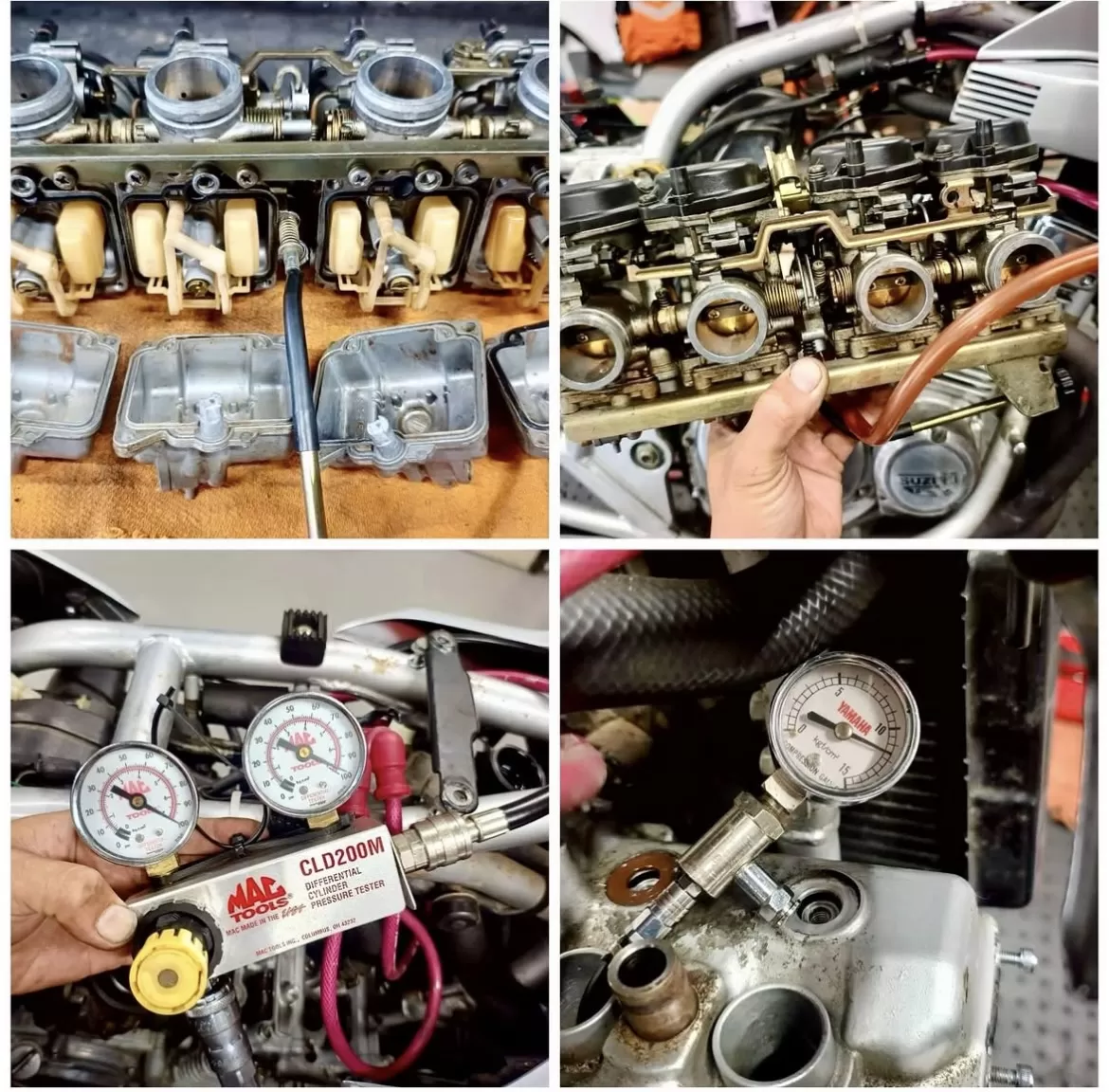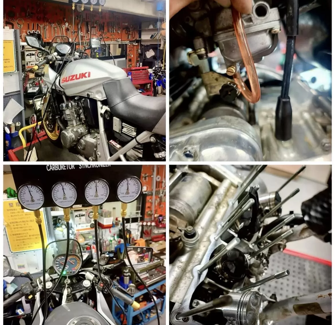 店主が車体をみたところ、確かに異音もするが、4気筒のバランスが悪く、アクセル開度に回転数が追従しない不安定な状態で、燃調、同調のくるいがとにかく気になる、とのこと。走行にも悪影響を与え、安全とはいえません。