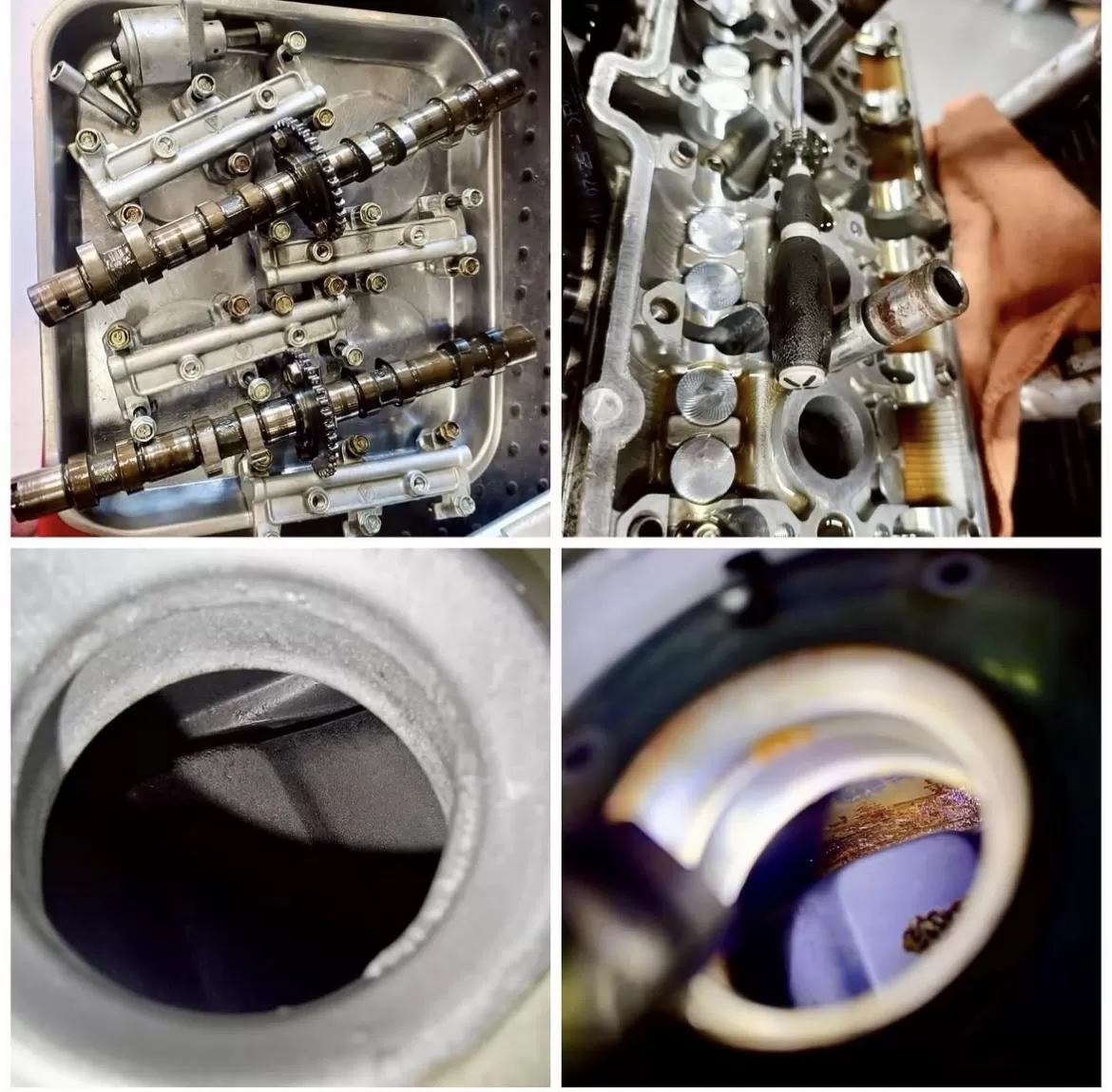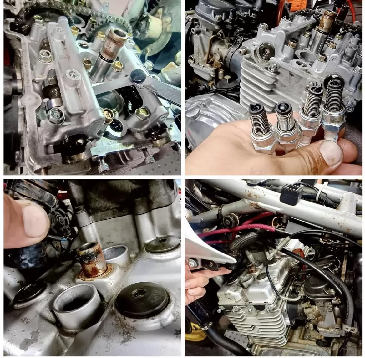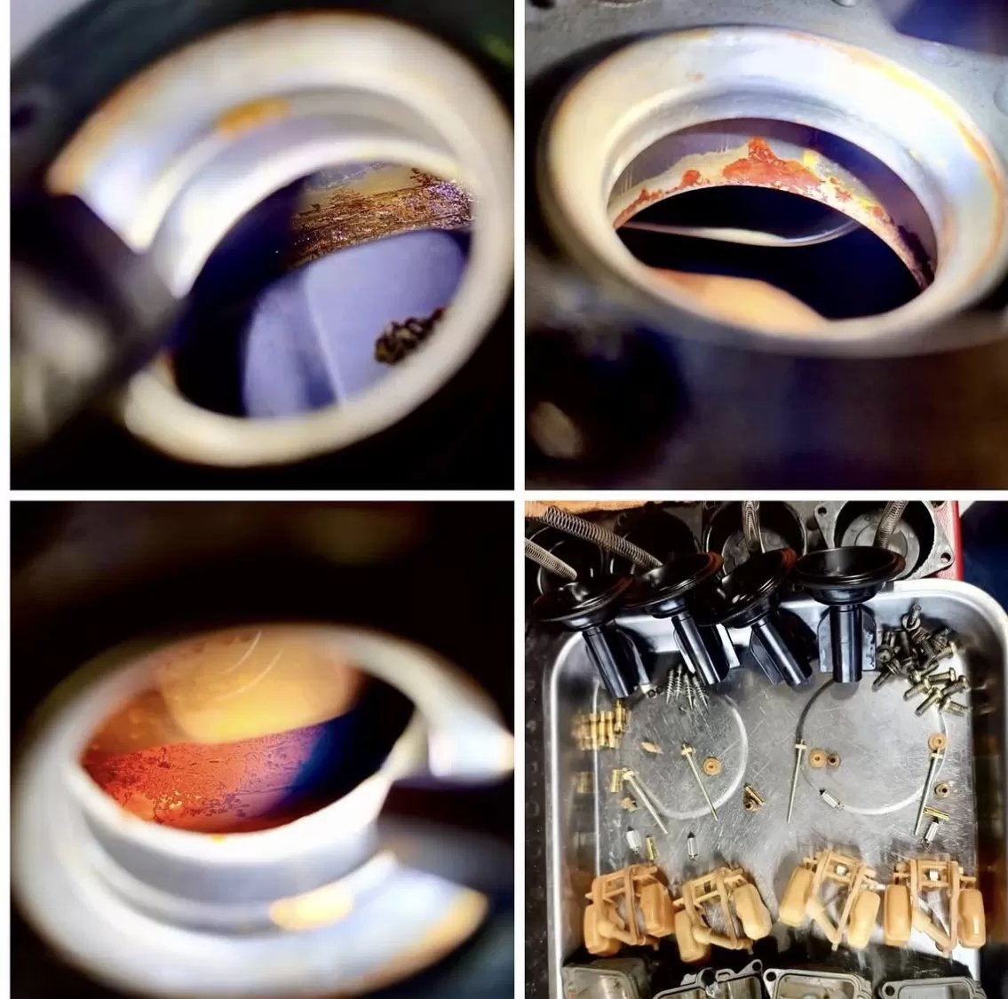 圧縮圧力測定、リークダウンテスト、バルブクリアランス、マフラーガスケットのチェックをし問題なし。異音の探求の為カムチェンテンショナー、カムチェン、カムギャーの点検をし異常なし。更にシリンダーヘッドを外しシリンダーを点検すると、4番シリンダーの傷、ピストンのかじりを発見。シリンダにはピストンリングが引っかかるような凹みがついていたため、これが異音の直接の原因であり、このピストン・リング・シリンダーの変形は、タンク内の錆がキャブを部分的に詰まらせ、燃調のあわないリーン状態になり、高回転の高負荷のなか、燃焼温度上昇、冷却不足で各部が油膜を保てず傷やかじりをおこした、ということになります。