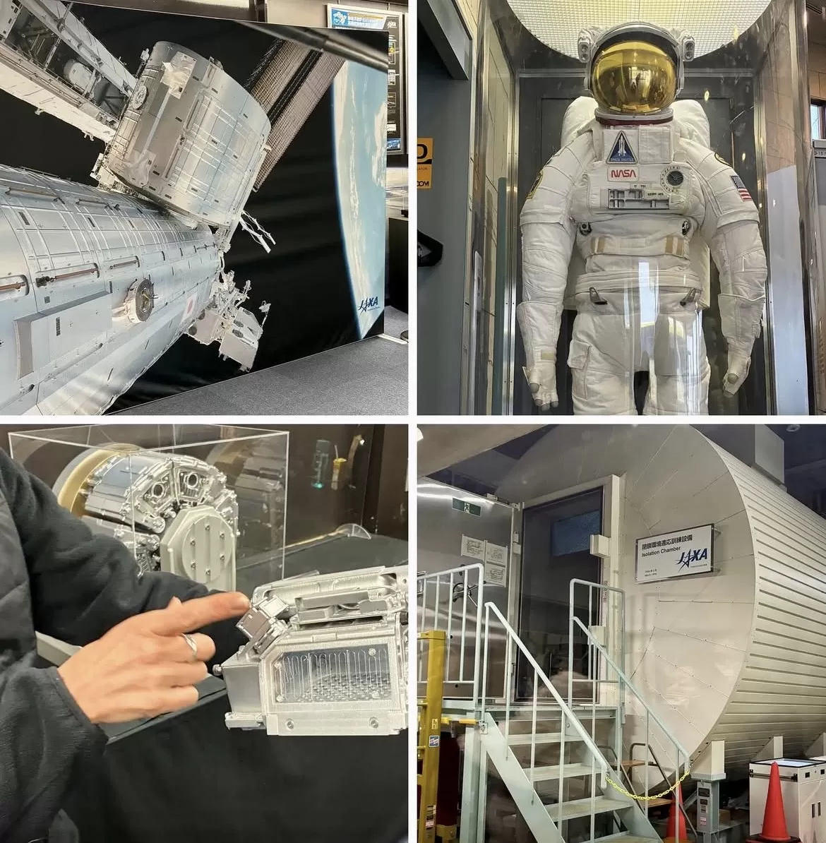 予約制ですが管制室がガラスごしに見学できます。国際宇宙ステーションISSの日本実験棟「きぼう」の機内環境などをリアルに監視している様子が目前に見られ、ここが宇宙とつながっている場所であることを実感できます(撮影は禁止されています)。様々なデータが日本の国防や防災、医療まで役立っているとのこと。そのための閉鎖的な生活環境と果てしない宇宙空間での船外活動を、見守り続ける管制室。大きなモニターが沢山あり映画のセットさながらです。中央にいる管制室リーダーの女性がガラス窓に張り付いている我々に手を振ってくださいました。