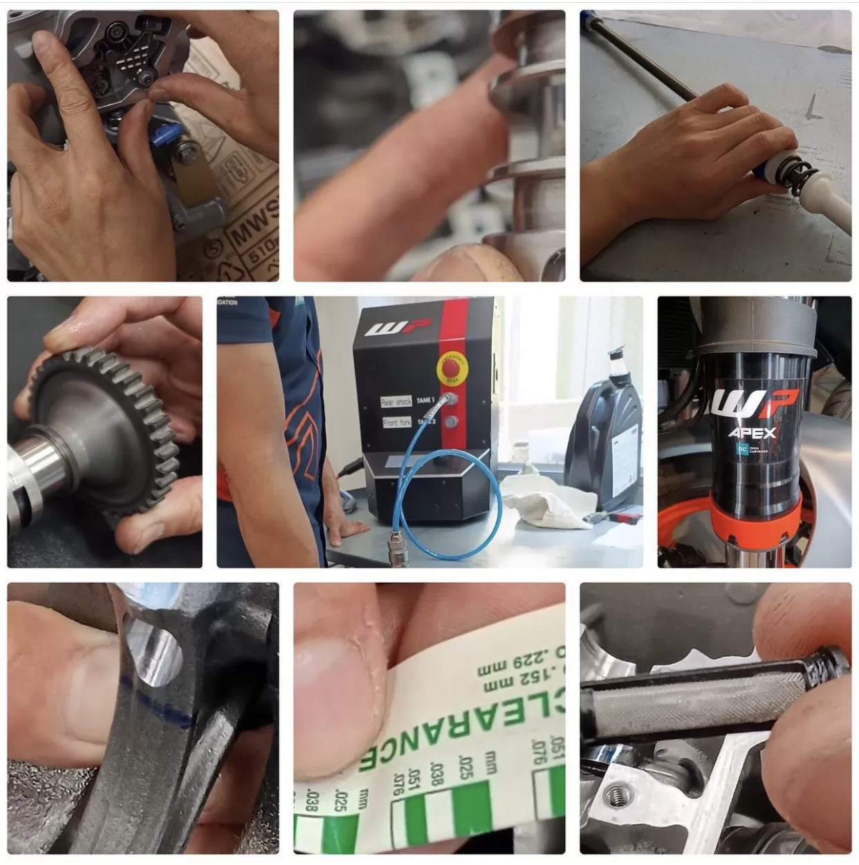 おもに24年の450EXC.350EXCF.250EXC-TBIのエンジンの新しい機構の仕組みや組付けの注意点について分解しながら確認しました。