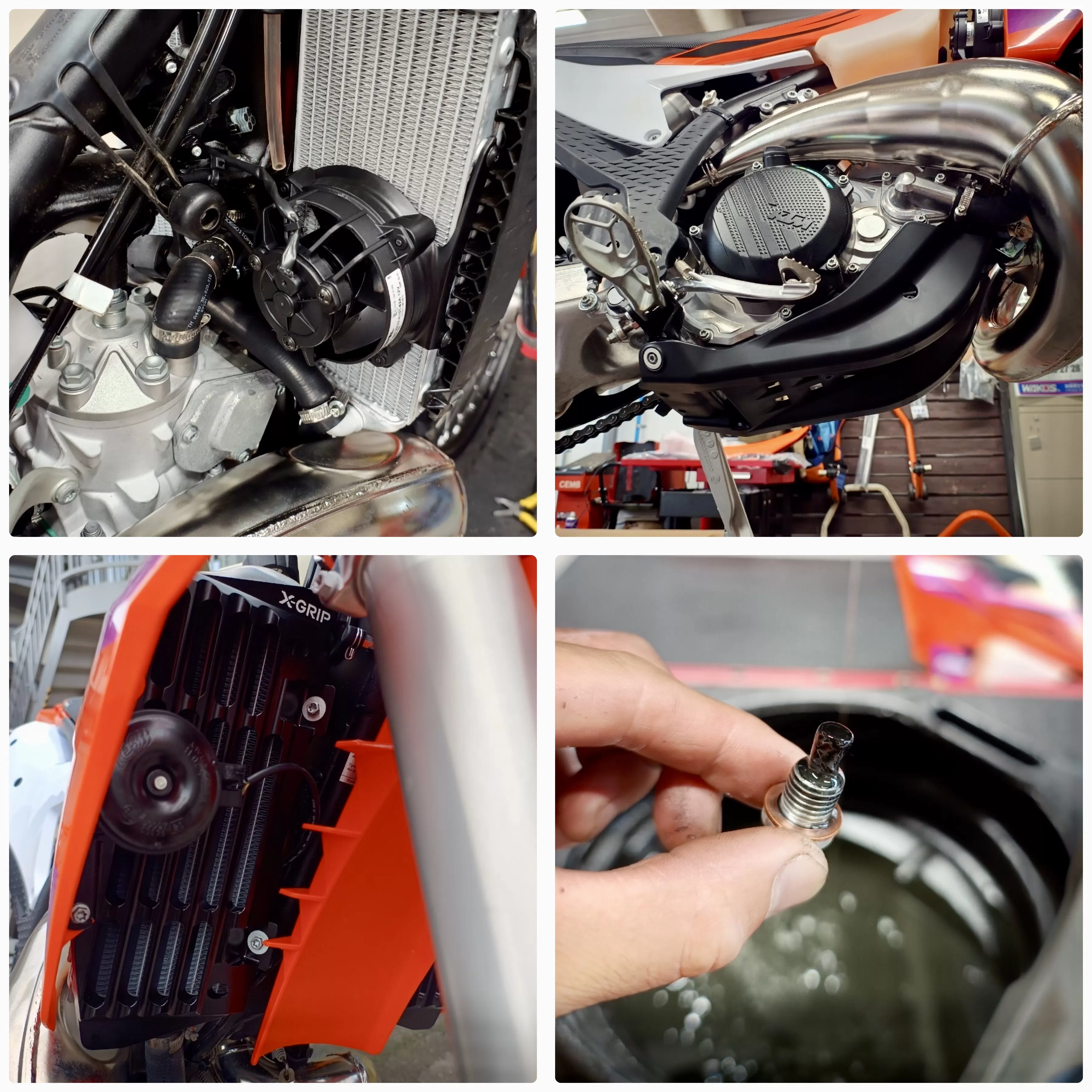 24MY 250EXCの初回点検、ギアオイル交換を行いました。同時にオプションパーツの取付。 クーリングファン スキッドプレート リアディスクガード ノーマルシートをローシートに XGRIPラジエタガード 全く初めてのオフ車とのこと。 当店コースで安全に練習できます。