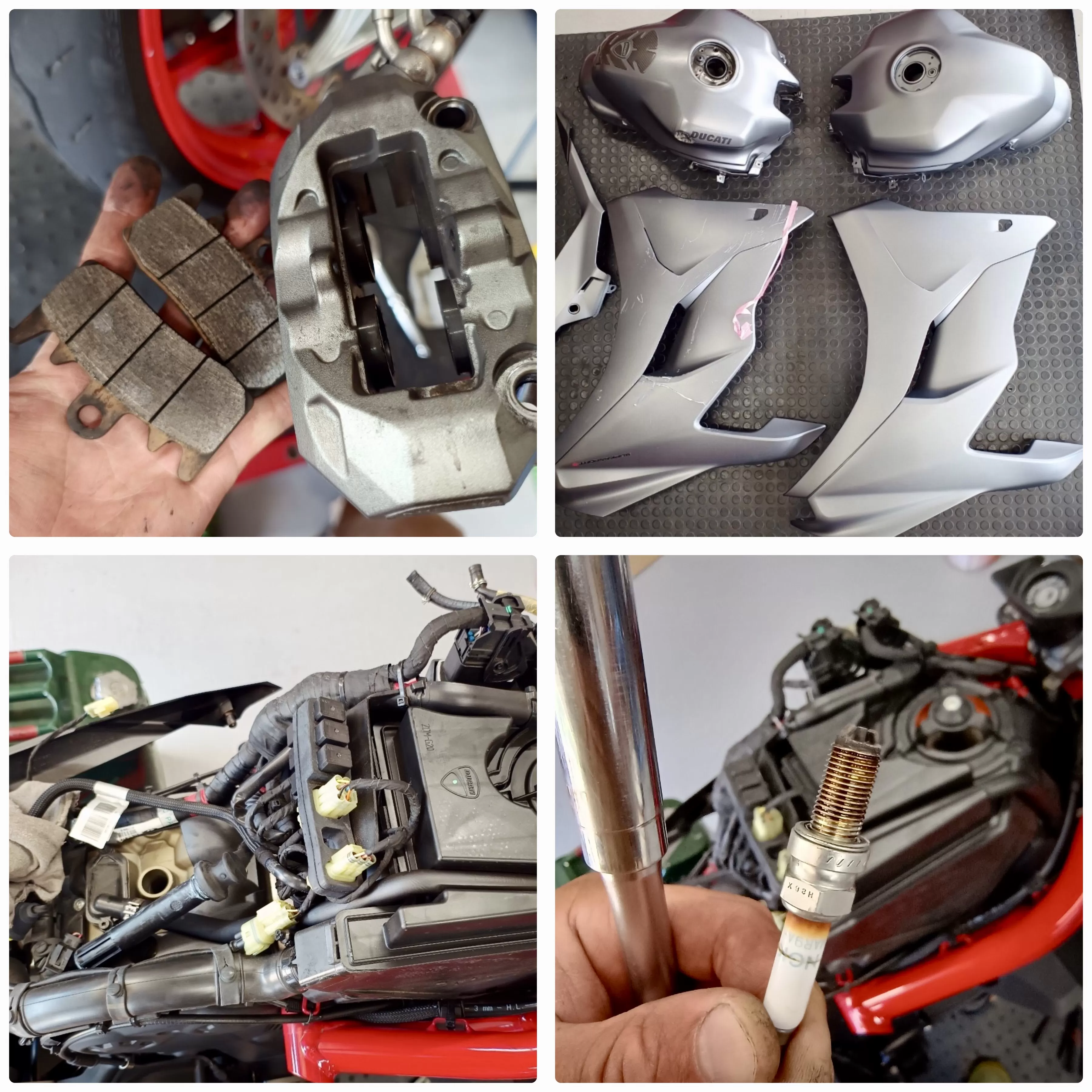 おまたせしました。#ドカティ#スーパースポーツ クーラント、ブレーキフルードの交換、ブレーキキャリパー、エアフィルター、スパークプラグの清掃、そして 燃料タンク、サイドカウル、リアサイドカウル、フロントフェンダー、ミラーウィンカーの再塗装及び補修。