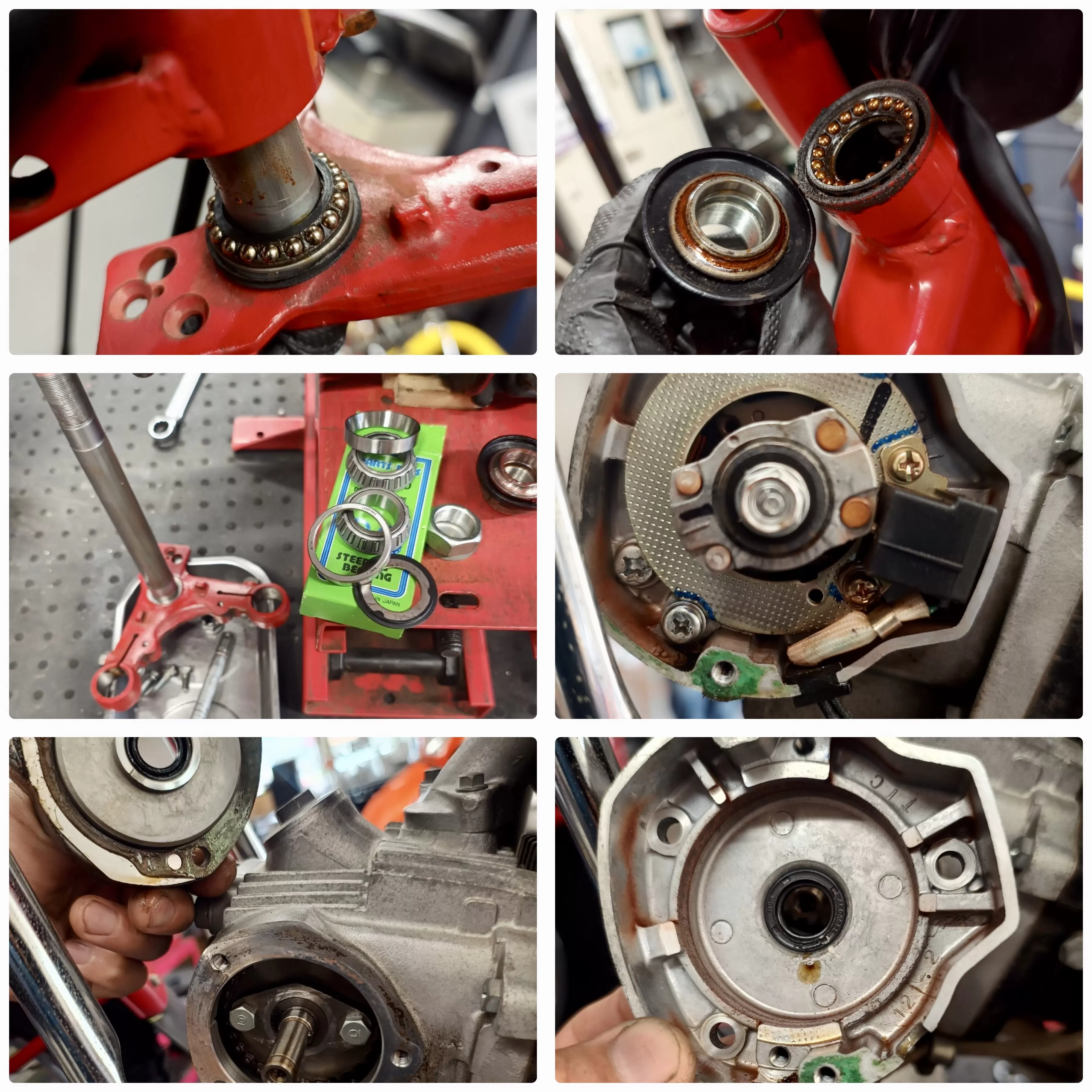 FRタイヤ、チューブ、ブレーキシュー交換 フロントフォークオーバーホール ステアリングヘッドベアリングは段付きがあり引っかかるので交換。強度の高いテーパーローラーベアリングを取り付けました。 キャブレターオーバーホール シリンダヘッドのオイル漏れ修理 CDIユニットのカムシャフトシールとガスケットを交換