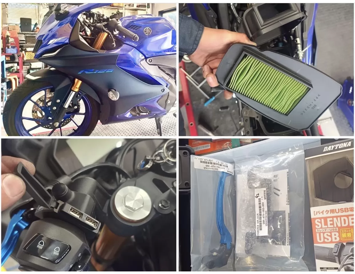 定期点検などなど #YZF R125 TEXAによるコンピューター診断もしっかりおこないます。 エアフィルター清掃 スパークプラグ清掃 ドライブチェーン清掃注油 クラッチレバーを鍛造可倒式に交換 アクセサリーマウント取付 スレンダーUSB電源取付