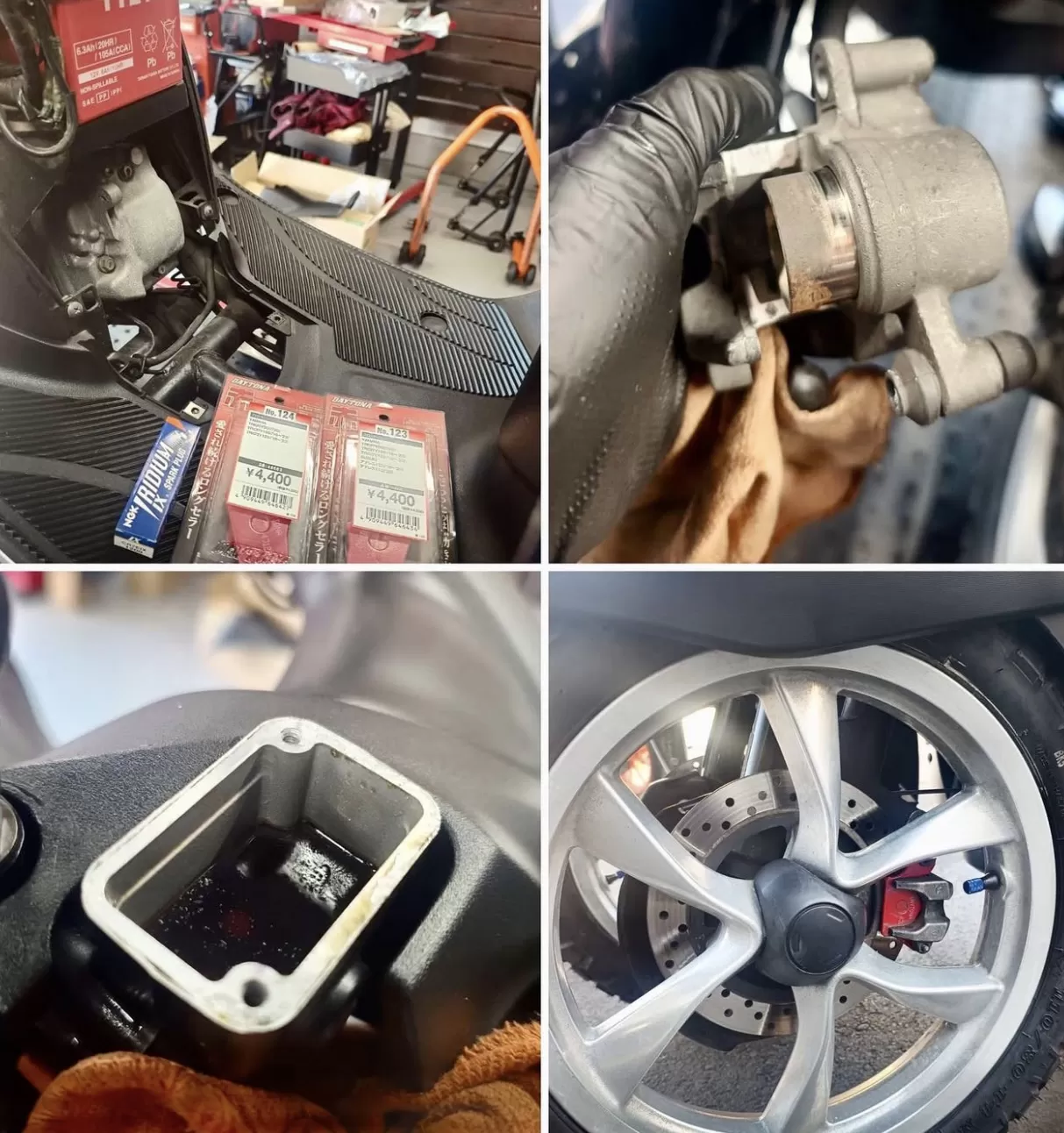 整備#トリシティ ゴツ目のタイヤを履かせたトリシティ。ウチのコースもぜひ走ってください! ブレーキキャリパーピストンの錆びが酷く、そのまま押し戻すとシールが破れてオイル漏れしてしまいます。清掃研磨しました。 クーラント交換 スパークプラグ交換 ブレーキパッド交換 ブレーキフルード交換