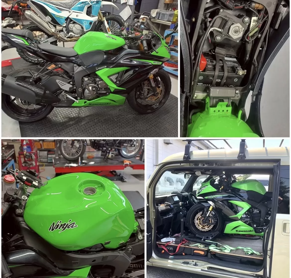 修理#ZX6R 転倒による燃料タンクの凹み修正及び再塗装 排気バルブ異音点検、調整 前後ブレーキフルード交換