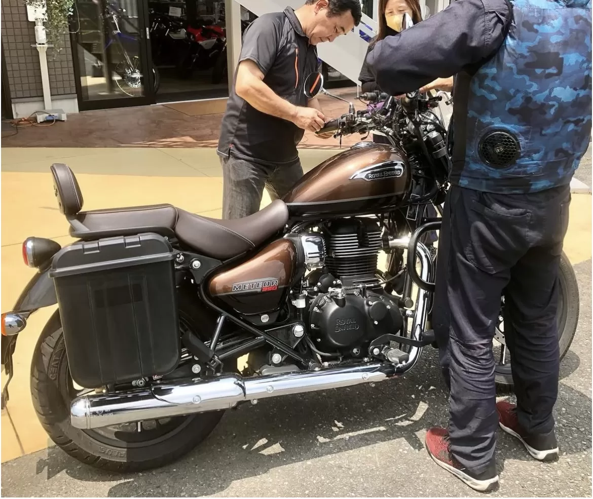 ブリクストンと悩んで#ロイヤルエンフィールド のメテオ350をお選びになったお客様。小柄な彼女にはレバーやスタンドなど、少し調整が必要のようです。