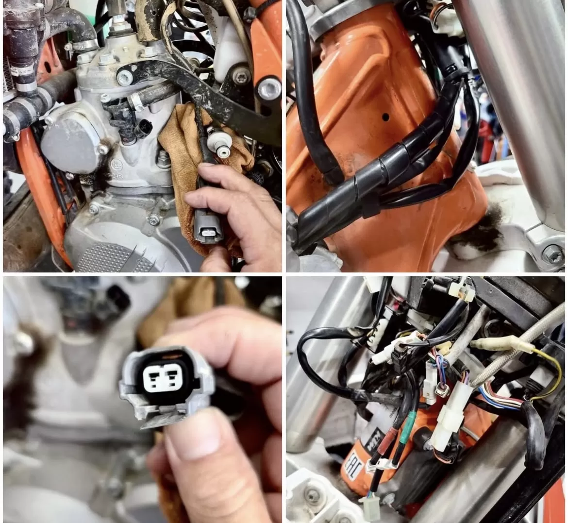 ギアオイル交換で入庫しましたが…#KTM#250EXCtpi 2スト キルスイッチが効かずエンジンが止められません。その後ライトもつかなくなりウィンカーも機能しないため確認したところ、首元のメインハーネスが切れておりました。 また走行中にインジェクターのカプラーが抜けたことがあるとのことで、燃料タンクを外して確認したところカプラーが割れておりました。 お預かりさせていただき修理いたしました。