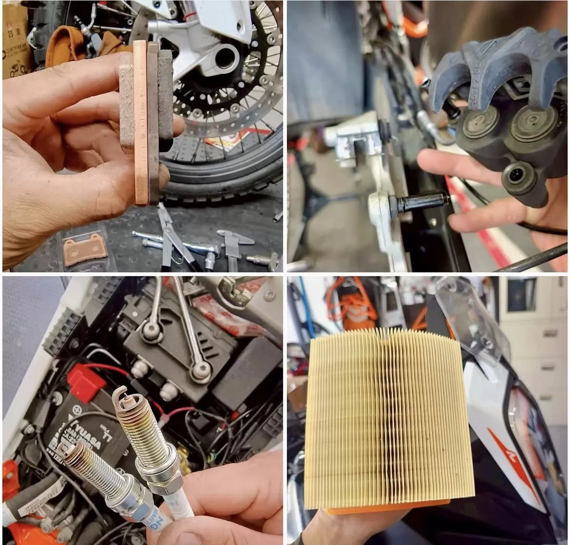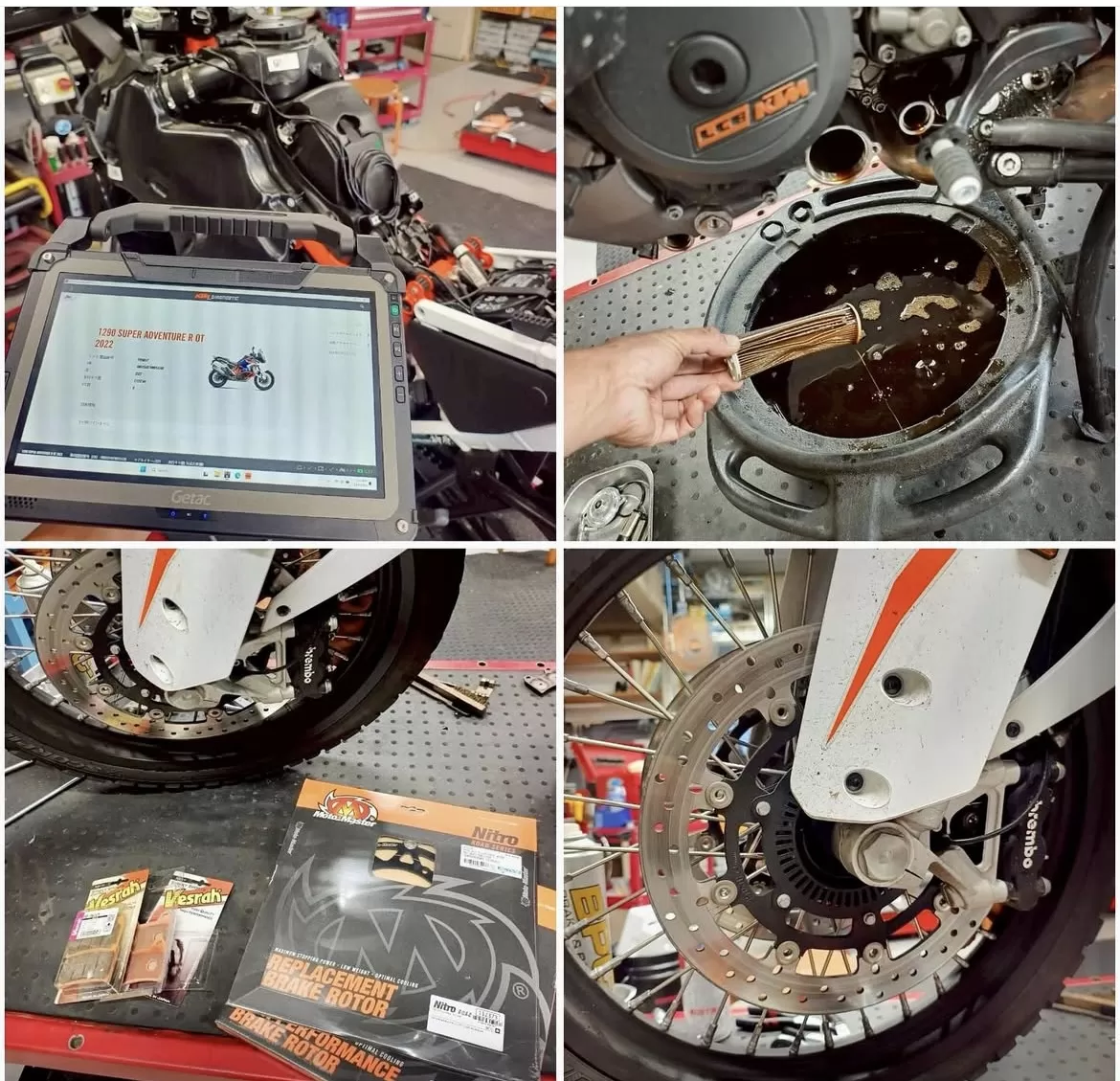 車検#1290superadventurer ラジエターフラッシング クーラント交換 エンジンオイル、フィルター交換 ブレーキフルード交換 クラッチフルード交換 フロントブレーキディスク交換 フロントブレーキパッド交換 前後ブレーキキャリパー清掃 エアフィルター清掃 スパークプラグ清掃 OBD診断