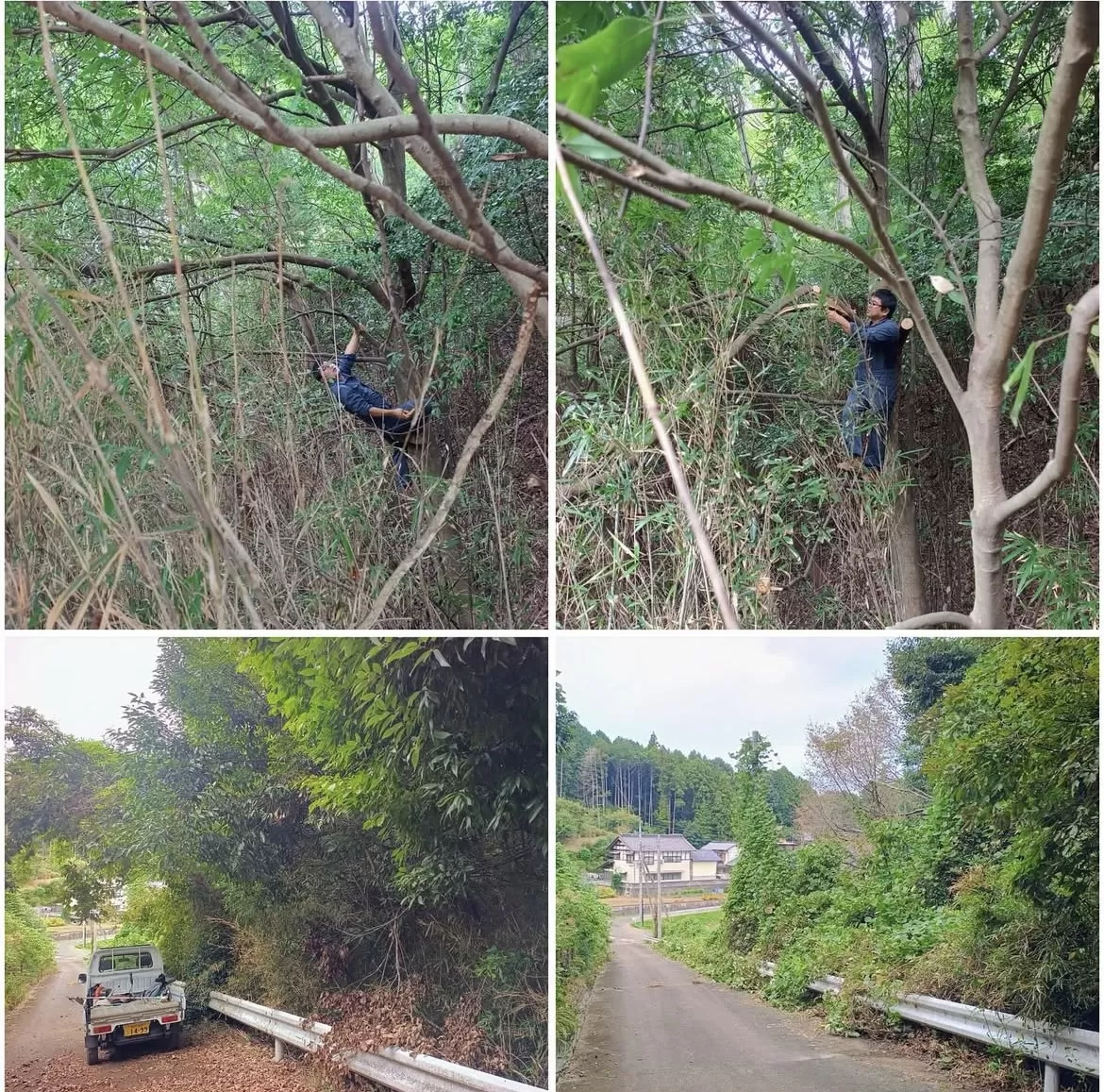 コースへ入るための側道は、ユンボの排土板を使ってお掃除を。垂れ下がってきた木も切っていきます。