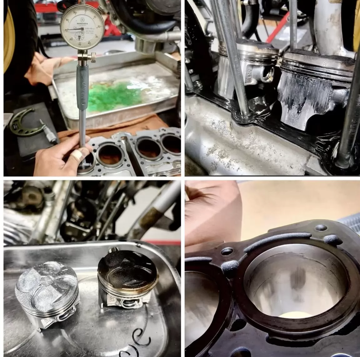 圧縮圧力測定、リークダウンテスト、バルブクリアランス、マフラーガスケットのチェックをし問題なし。異音の探求の為カムチェンテンショナー、カムチェン、カムギャーの点検をし異常なし。更にシリンダーヘッドを外しシリンダーを点検すると、4番シリンダーの傷、ピストンのかじりを発見。シリンダにはピストンリングが引っかかるような凹みがついていたため、これが異音の直接の原因であり、このピストン・リング・シリンダーの変形は、タンク内の錆がキャブを部分的に詰まらせ、燃調のあわないリーン状態になり、高回転の高負荷のなか、燃焼温度上昇、冷却不足で各部が油膜を保てず傷やかじりをおこした、ということになります。