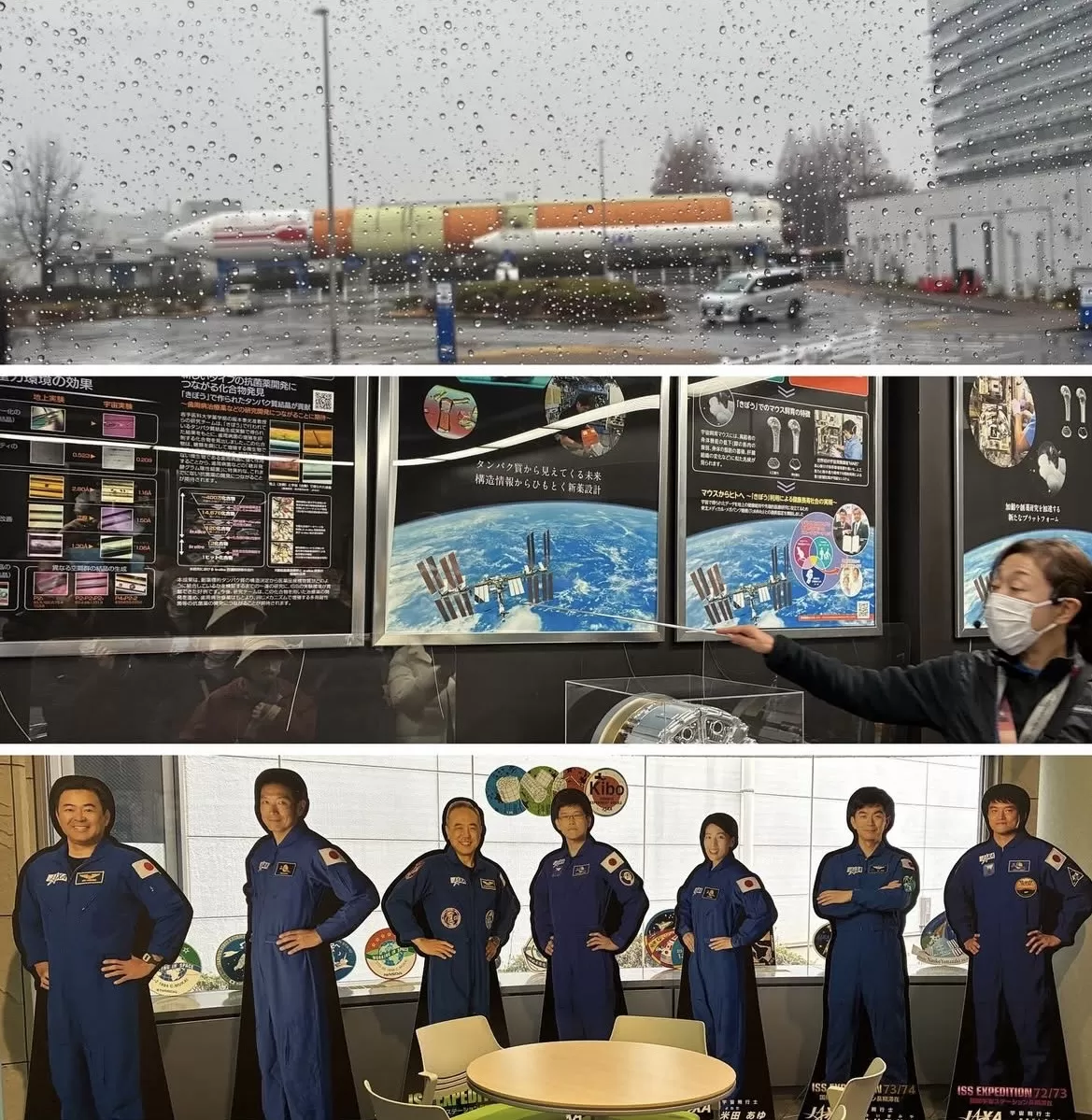 予約制ですが管制室がガラスごしに見学できます。国際宇宙ステーションISSの日本実験棟「きぼう」の機内環境などをリアルに監視している様子が目前に見られ、ここが宇宙とつながっている場所であることを実感できます(撮影は禁止されています)。様々なデータが日本の国防や防災、医療まで役立っているとのこと。そのための閉鎖的な生活環境と果てしない宇宙空間での船外活動を、見守り続ける管制室。大きなモニターが沢山あり映画のセットさながらです。中央にいる管制室リーダーの女性がガラス窓に張り付いている我々に手を振ってくださいました。