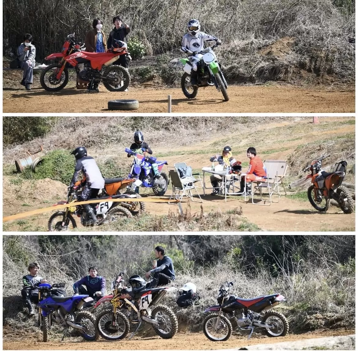 バーチカルツインが通ります〜 最新シェルコのシェイクダウンの横で。 相当前のCRF250xやら カワサキやKTMやQJモータースや。。 お好きな車両でマイペースで走ってください。 練習ですから〜 あ、壊れたら直します〜
