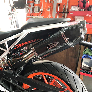 カスタム例として、画像はFフォークに社外のインナーカートリッジを、バネレートとシムをお客様に合わせセミオーダー。Rショックにも社外の別体型窒素タンク式をセット。どちらも細かくプリロード調整とダンピング調整ができます。「路面追従性が高まりピッチングがなくなり、安定したコーナリングで楽しくなった」とオーナー様。この他、モタード化で用途を変えたり、カフェレーサー風にスタイルを一新したり、カスタムで楽しみが広がります。