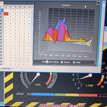 シャーシダイナモを使って出力と空燃比のデータを正確に把握。これを元にサブコン等で補正をかけたマップを作成し、お好みの場面で切り替えることが可能です。さらに、お手元でマップのさらなる補正やレブリミッター、クイックシフター、トラクションコントロール等の調整ができる付加パーツもございます。